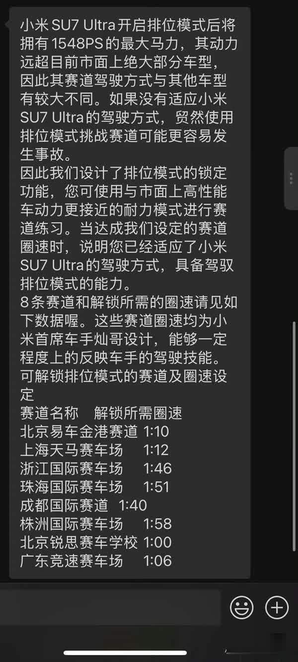然而,博主也指出,对于已经购买SU7 Ultra的部分车主来说,通过赛道圈速才能解锁最大马力这一要求可能不太合理。例如,有些车主购买该车是为了在场地进行0-400km/h的加速测试,或者有些车主所在的赛道不在小米官方规定的范围内。如果想解锁最大马力,车主可能需要自行承担费用将车运到指定赛道进行测试。