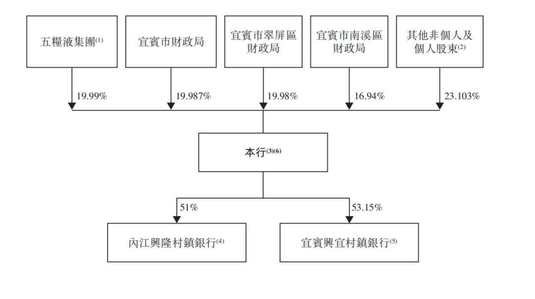 根据招股书披露,宜宾市商业银行前四大股东分别为五粮液集团、宜宾市财政局、宜宾市翠屏区财政局、宜宾市南溪区财政局,持股比例分别为19.99%、19.987%、19.98%、16.94%。