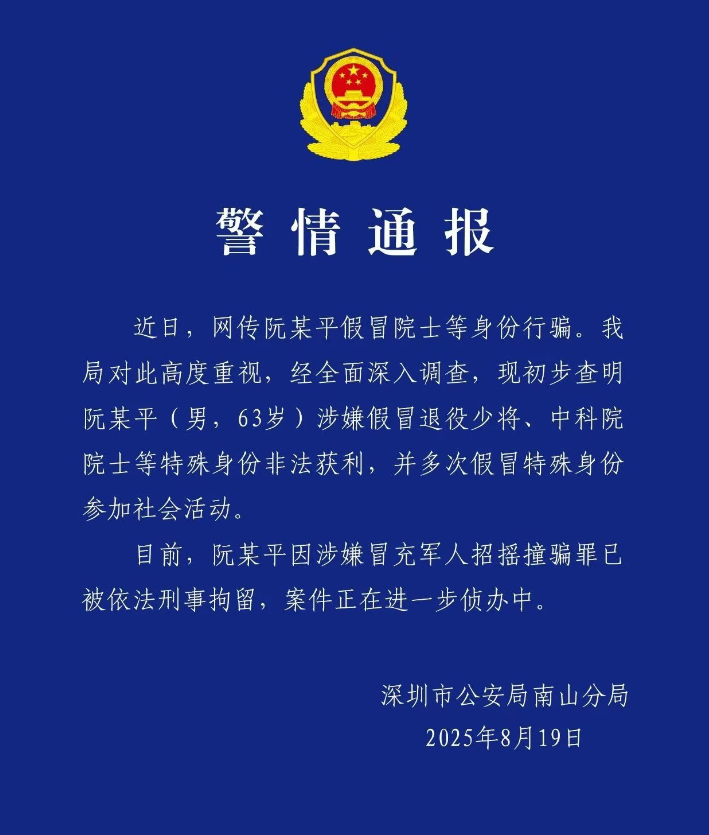 8月19日,深圳市公安局南山分局发布警情通报,阮某平因涉嫌冒充军人招摇撞骗罪已被依法刑事拘留中证所。通报显示,深圳警方全面深入调查,现初步查明阮某平(男,63岁)涉嫌假冒退役少将、中科院院士等特殊身份非法获利,并多次假冒特殊身份参加社会活动。目前,阮某平因涉嫌冒充军人招摇撞骗罪已被依法刑事拘留,案件正在进一步侦办中。